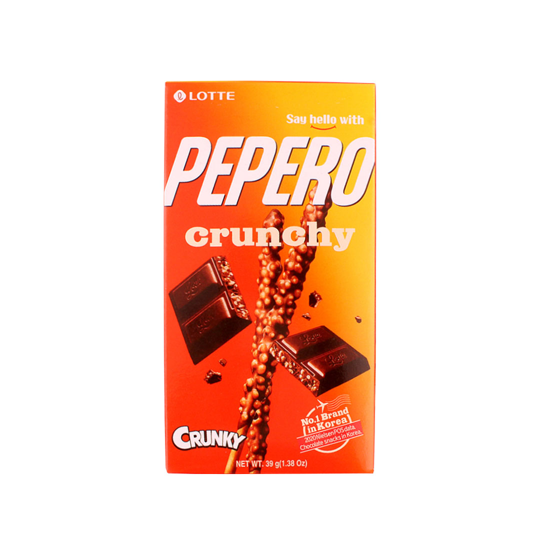 Lotte Pepero Crunchy is a popular Korean snack consisting of thin, biscuit sticks coated in a rich chocolate layer and sprinkled with crunchy cookie bits. This combination offers a delightful mix of textures and flavors, making it a favorite treat for chocolate and snack lovers alike.