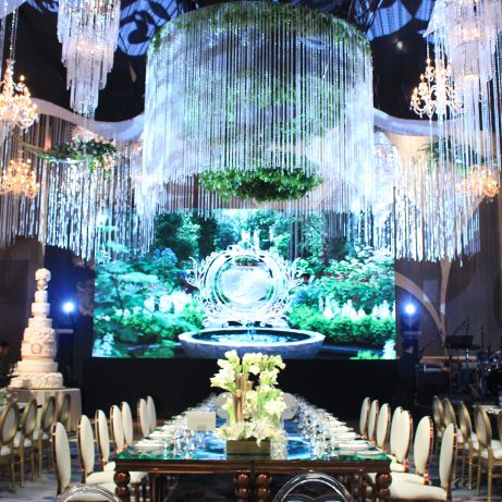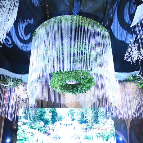 A lush and fresh ceiling installation using combination of crystals with fresh foliage leaves is absolutely stunning and brought an element of nature in while staying luxurious and glamorous.
