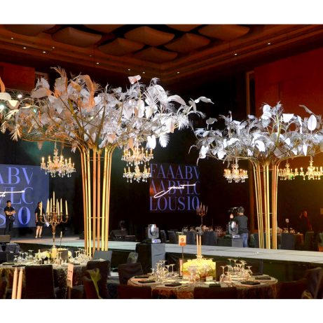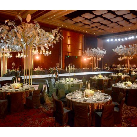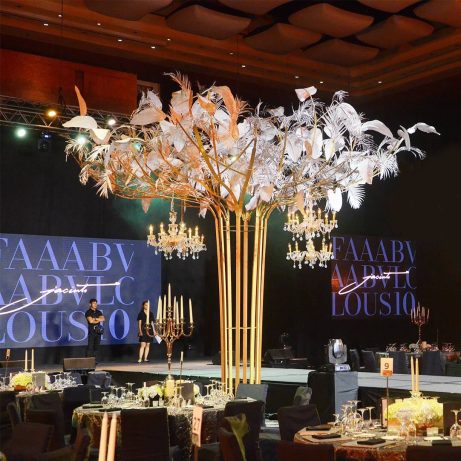 A 15 Feet Tall and 14 feet top diameter steel gold Tree with fresh foliage (in painted white or natural green) accented with 4 hanging 8 – Arms Crystal Chandeliers. Rate is all-in including materials, labor and staff meals. Structure Only is also available for rent at Php10,000.00 per unit. Please proceed to Rental Items under “Props and Others”.