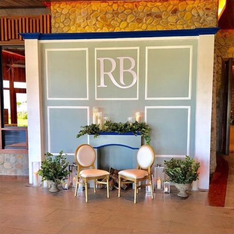One of our original photowall is this fireplace inspired 10ft x 12ft piece. This is made with quality assured materials for sturdy installation. It’s designed with real plants, clear cylindrical vase with candles, square lamps with candles, logs, and 2 of our specialty chairs