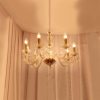 This detailed chandelier has 8 intricate arms with bobeche made out of crystal and candlelight bulbs on top of each arm contained in a gold case and additional hanging crystal details.