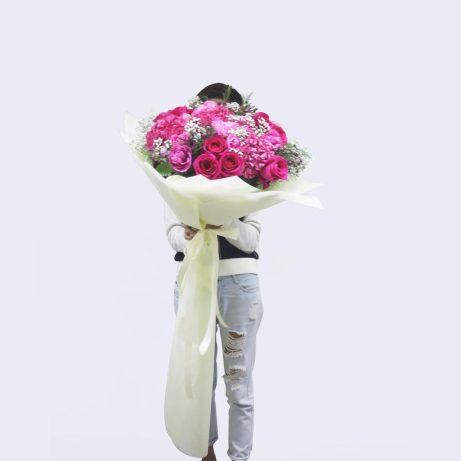 A perfect arrangement for a special occasion which consists of imported vibrant flowers such as roses, hydrangeas and wax flowers.